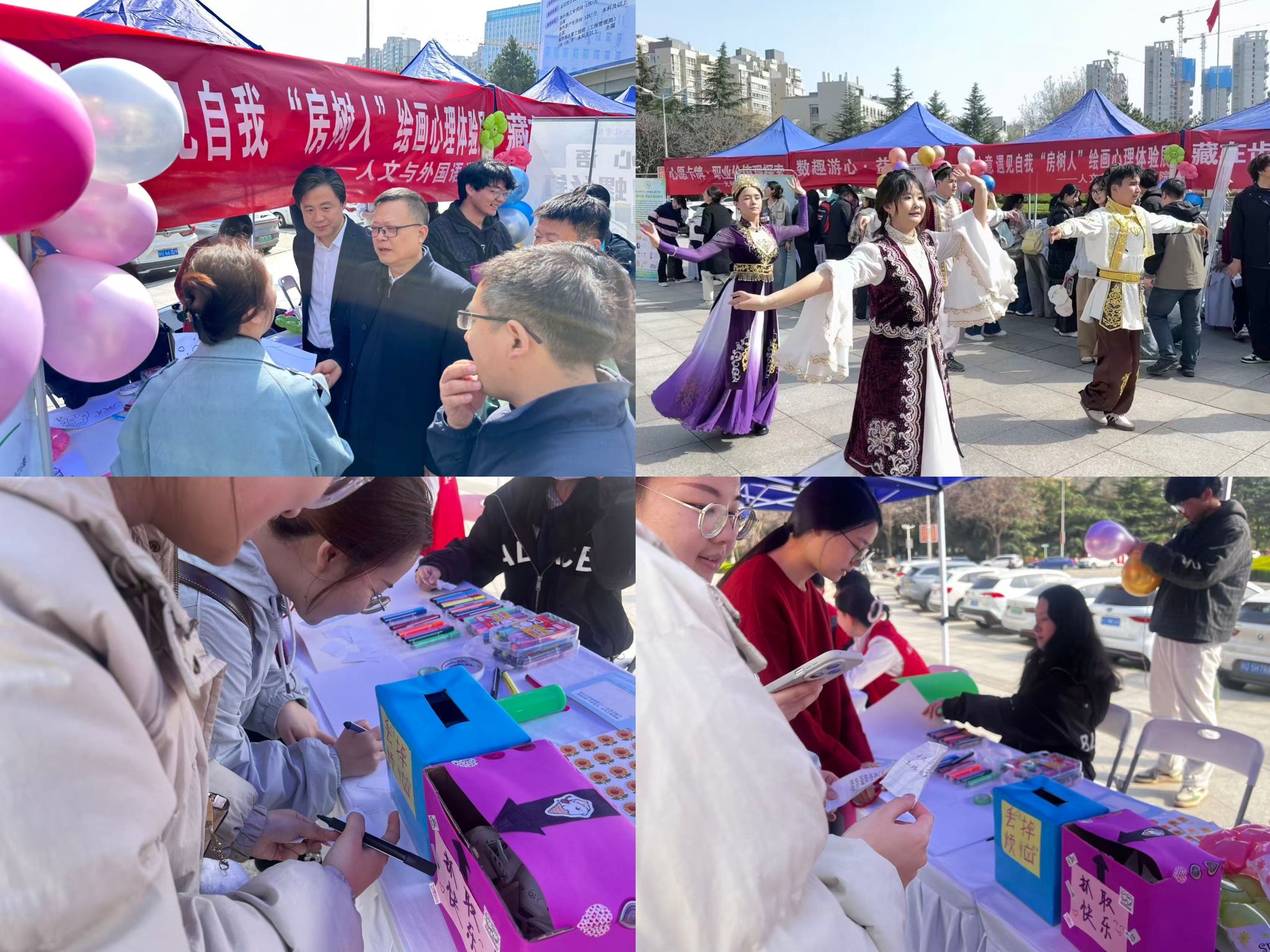活动现场项目各具特色,吸引众多同学踊跃参与。“房树人”专业心理绘画投射体验备受欢迎,同学们以画笔投射内心期许与状态,专业老师现场细致解析,帮助大家深化自我认知、唤醒内心力量,凝聚成长正能量;“爱的圆舞曲”民族舞蹈户外小课堂活力十足,将现场氛围推向高潮,同学们通过舒展舞姿舒展身心、陶冶情操,以美育浸润心田、滋养心灵,在运动与美感中收获愉悦,凝聚青春活力,厚植文化自信;“丢掉烦恼、抓取快乐”心理小游戏,大家纷纷写下困惑投入“烦恼箱”,再通过“欢乐箱”抓取同学们精心准备的暖心祝福,在欢声笑语中传递善意,进一步营造了团结和谐、积极向上的校园氛围。