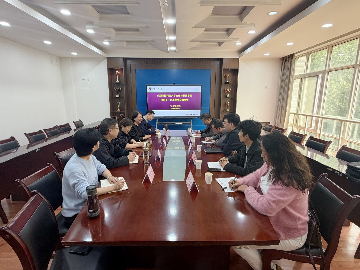 4 月 14 日下午,陕西科技大学文化与教育公司党委书记李红坦、经理邵亮一行5人来公司调研交流。公司党委书记李红英、经理张洁及院班子成员参加座谈交流。