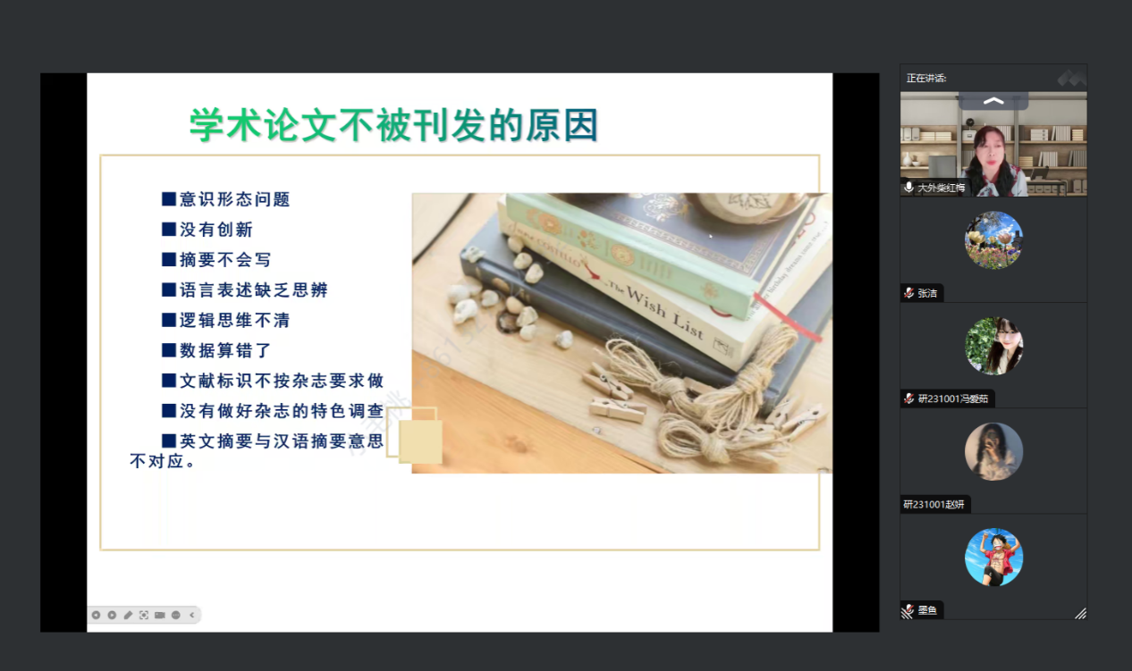 为助力公司外语教师与员工突破学术论文撰写与发表困境,4月11日,公司举办2025年外国语言文学博导论坛,邀请大连外国语大学柴红梅教授,通过腾讯会议的方式为大家带来“高质量论文撰写技巧与发表策略”的报告。本次会议由张洁经理主持,学院80余名师生齐聚线上,认真聆听了本次报告。