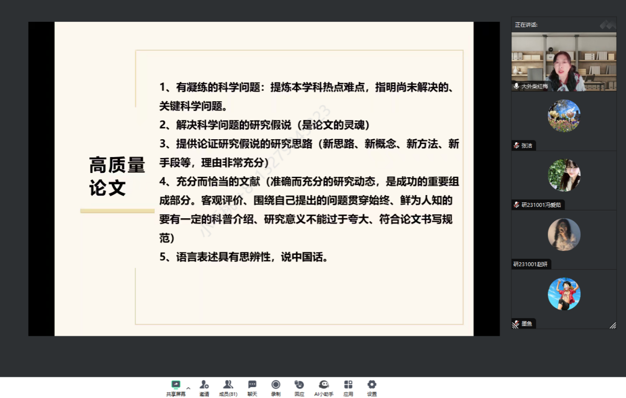 柴红梅教授在报告中,以丰富的经验和详实的案例,聚焦高质量论文撰写与发表,深入剖析诸多技巧与策略。她首先以学位论文盲审及学术论文刊发的注意事项引出话题,强调高质量论文撰写技巧与发表策略的重要性,接着从论文准备、论文选题、论文撰写与论文发表四个方面展开讲解。