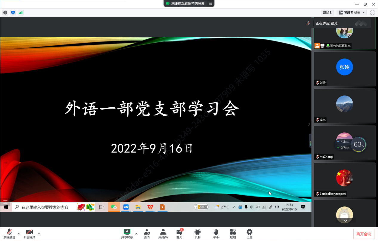 9月16日下午2点半,外语一部党支部使用腾讯会议召开党支部学习会。会议由支部书记翟芳同志主持,外语一部党员参加了此次会议。