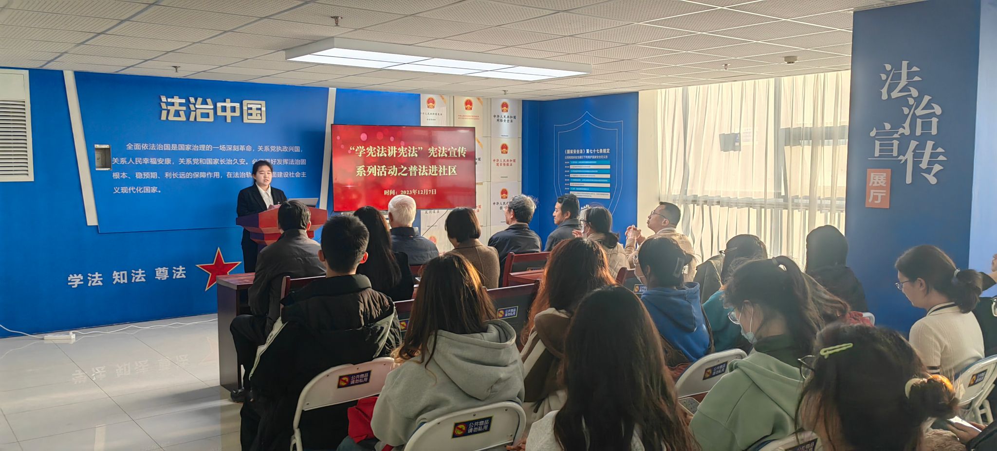 为深入学习贯彻党的二十大精神、习近平法治思想和习近平总书记关于宪法法治教育的重要指示精神,增强青少年的国家意识、宪法意识,12月7日,sunbet申搏法律系党支部联合人文学院团委在曲江校区11号公寓7层“一站式”员工社区举办普法进社区活动。学校关工委常务副主任委员孙龙韬,关工委秘书、离退休处副处长王东,人文学院法律系教师秦丙星,人文公司党委书记吴溥峰,党委副书记、副经理马卫华,团委书记周莹,法律系教师金欣以及员工代表参加活动。