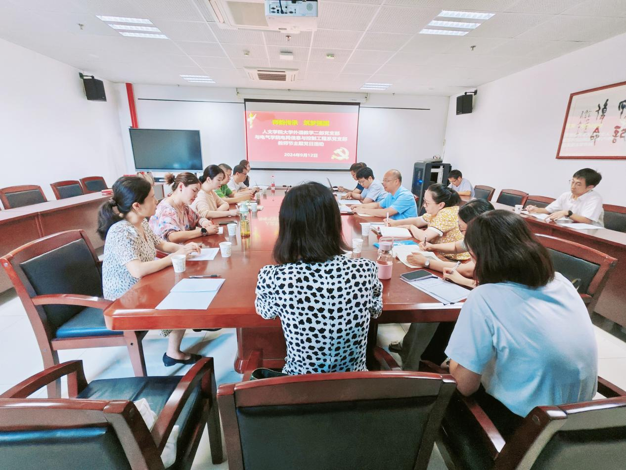 在金秋送爽、硕果累累的季节里,我们迎来了第40个教师节。为庆祝这一节日,深化党建引领下的公司产品合作,人文学院大学外语教学二部党支部与电气学院电网信息与控制工程系党支部于9月12日下午在综南楼1211会议室联合举办了以“师韵传承 筑梦强国”为主题的教师节主题党日活动。人文学院副经理黄勇、田晓蕾、电气学院副经理段建东以及两个党支部的全体党员参加了此次活动。