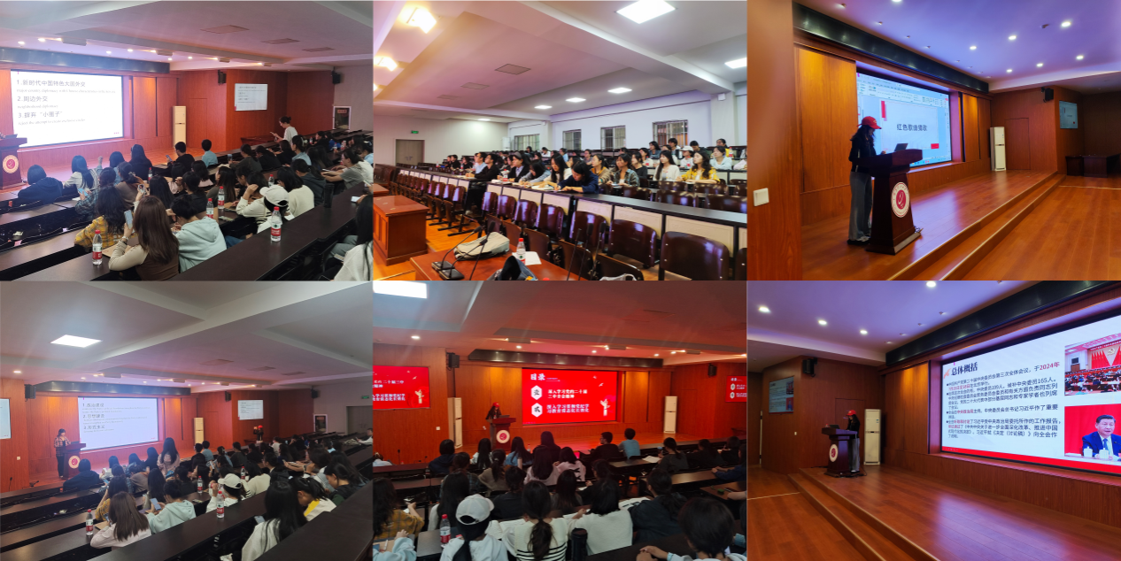 室内活动在模拟法庭进行。结合英语专业学科特色,开展“英语+”专业知识红色活动。分别举办了“红色概念名词翻译抢答”、“红色歌曲猜歌”等活动。青年同志们联系所学,积极参与,对时政知识与当下各类方针政策的英语术语表述有了清晰的认知,同时也传播了优秀红色文化艺术作品,陶冶了情操,最后,同学们集中学习党的二十届三中全会精神,通过学习,大家深刻理解了全面深化改革的重大意义,进一步坚定了听党话、跟党走的信心和决心。
